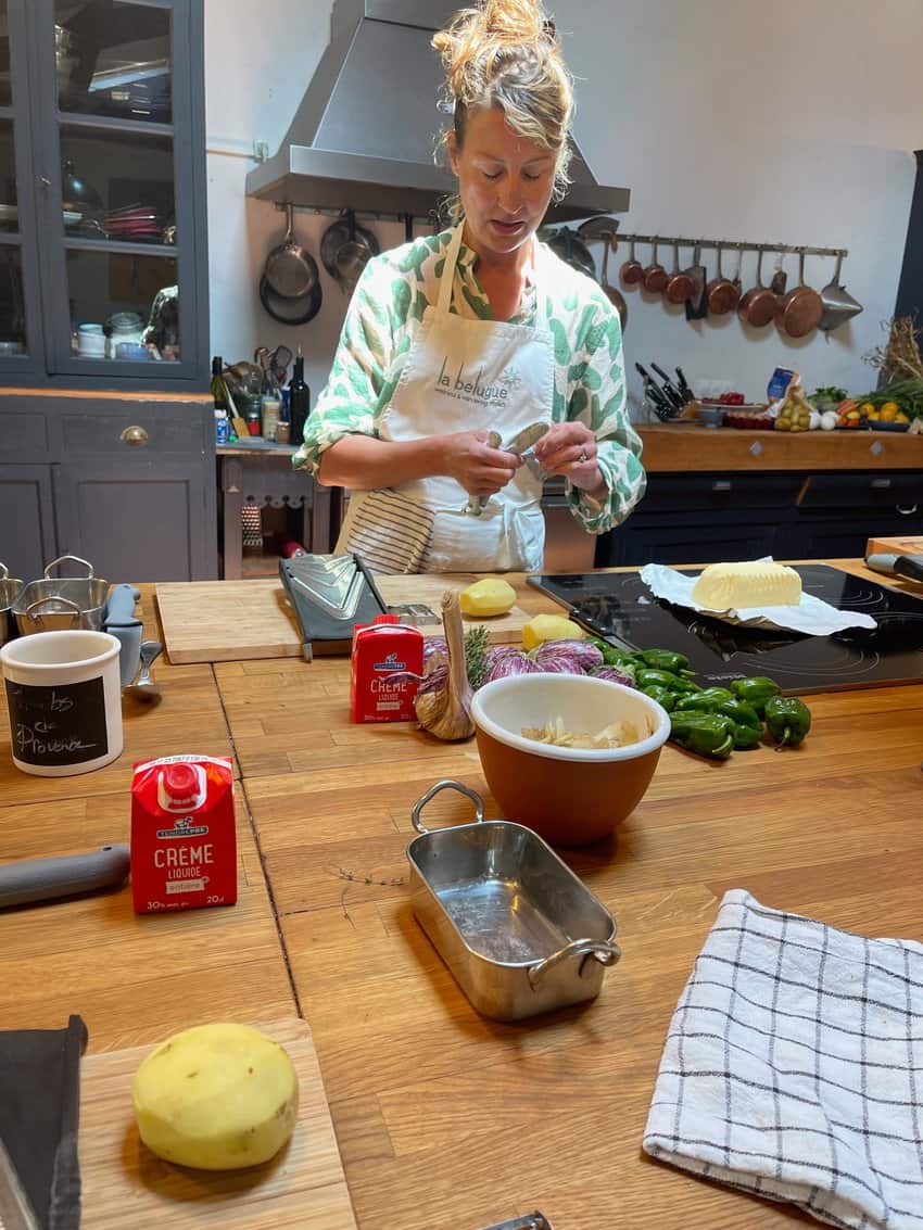We visited La Belugue in June 2023 and quickly fell into synch with Kelly and her kitchen. It was divine! Outside, the temperatures were sunny and bright, and we set off to find a farmer’s market where they had zucchini flowers.